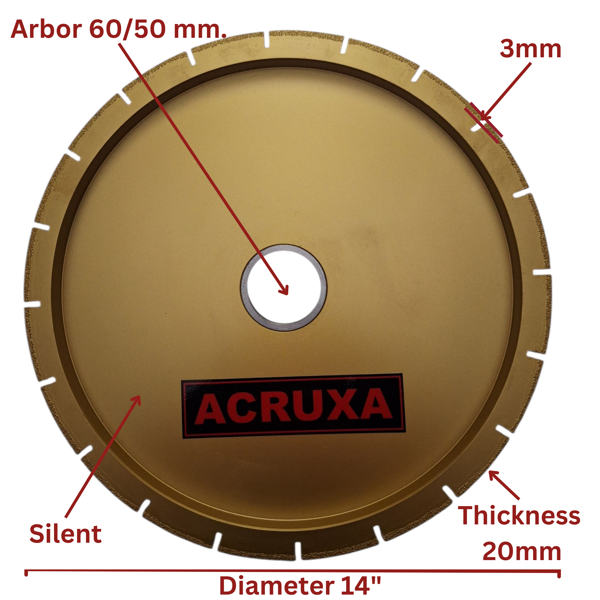 Diamond Radius Wheel used to make designs on (Marble, Onix, Travertine, Quartz). Diameter 14″. Thickness 1-1/4″. Bore 60/50mm. Vacuum welded. Made of Electroplated Diamond to…